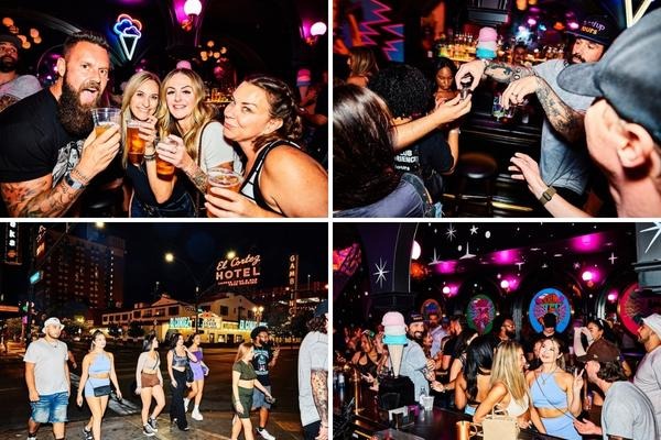 Four-panel image of The Block Bar Crawl in downtown Las Vegas showing groups of people drinking at bars, dancing to live DJs, and celebrating under neon lights during a guided nightlife walking tour.