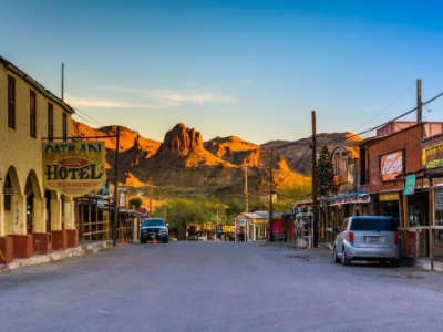 Oatman is a former mining town located in Mohave County, Arizona that was established in 1915. It was once a thriving gold mining center and one of the largest gold producers in the American West. The town is known for its historic buildings, including many false-front buildings on Main Street that house shops, saloons, and restaurants where shootouts are held. It is also famous for its wild burros that roam the streets. These mules are the descendants of the pack animals used by miners in the past and are protected by law.